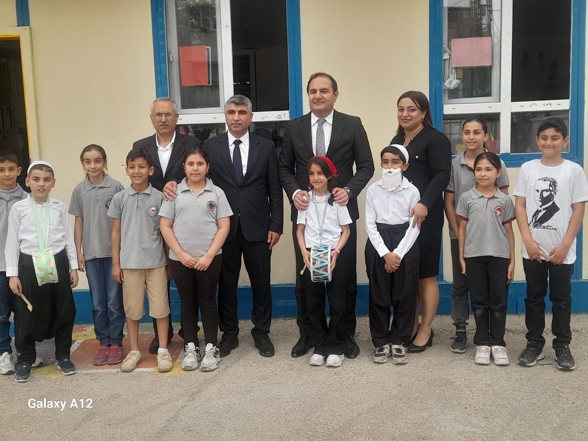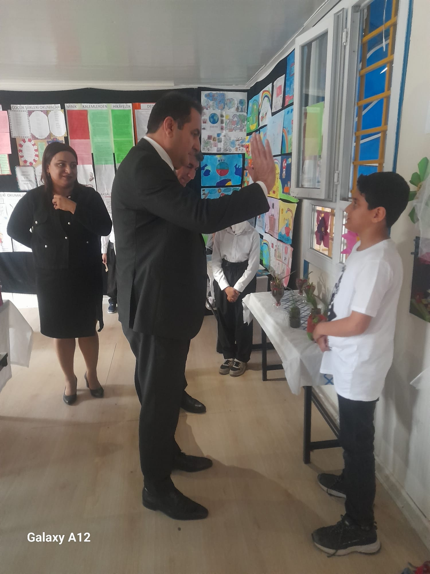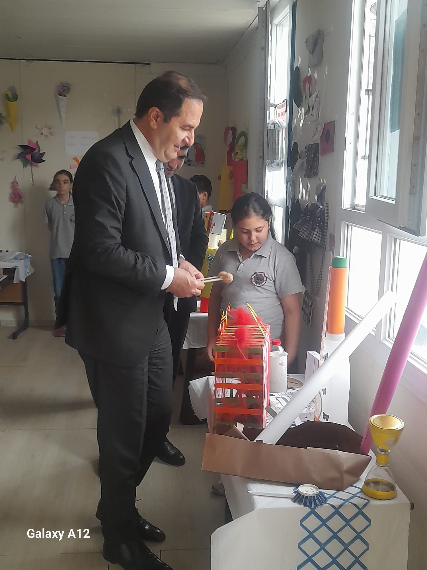 Daha sonra öğretmen ve öğrencilerinin el emeği göz nuru hazırladıkları 23 Nisan konulu resim ve geri dönüşüm konulu sergiyi gezen Murat Çelik, Sergide yer alan eserleri eserlerini dikkatle inceledi. Öğretmen ve öğrenciler ile yakından ilgilenerek çalışmalarında başarılar diledi.