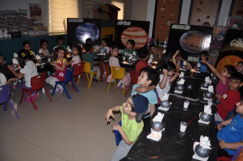 Eğlenerek öğrenmeyi ve keşfetmenin heyecanını aşılayan derslerde, sınıflar minik bir laboratuvara dönüştürülüyor ve yaşlarına uygun olarak seçilen deneyler ve astronomi etkinlikleriyle, uzay hakkındaki tüm sorulara cevap bulunuyor. Uzay ne demek, uzayda hangi gezegenler bulunur, diğer gezegenlerde yaşam var mıdır, gezegenlere yolculuk nasıl yapılır, astronot kime denir, neden farklı bir kıyafet giyer gibi sorulara yanıtların verildiği, aynı zamanda bu cevapların görsel materyallerle desteklendiği etkinlikte çocuklar sorularıyla meraklı dünyalarını aydınlatmaya çalışıyor.