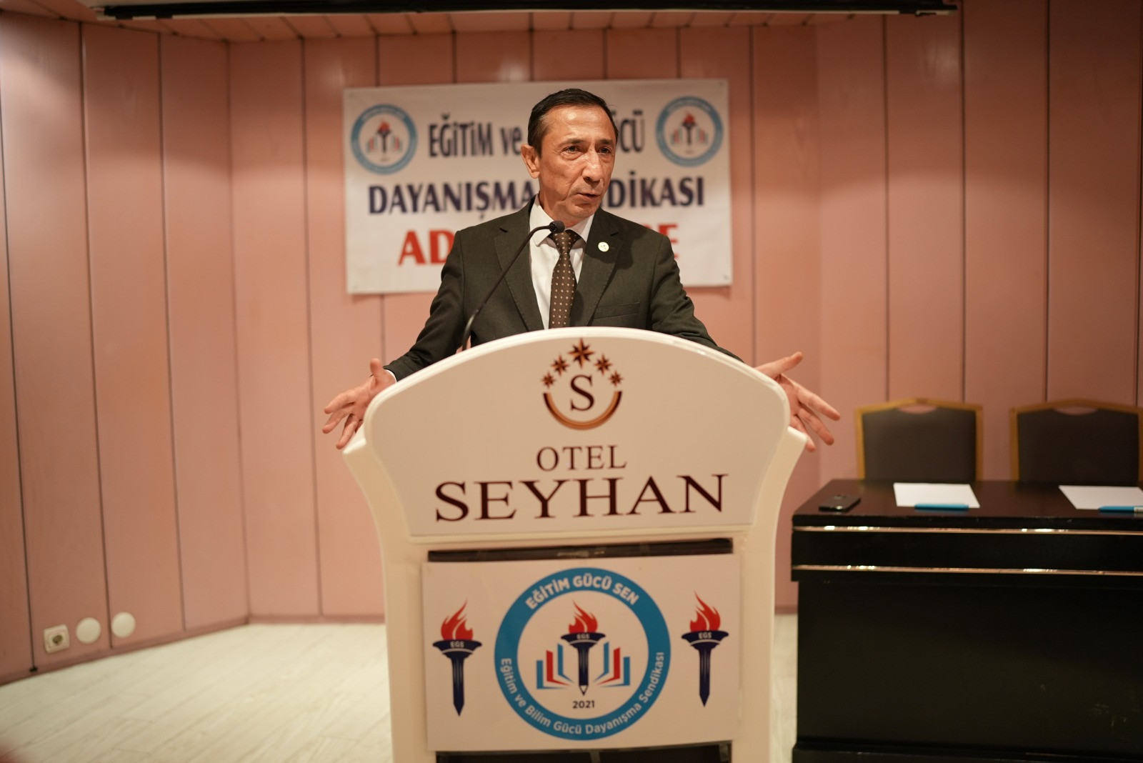 Genel Başkan Oğuz ÖZAT, yaptığı konuşmada sendikanın dört yıl gibi kısa bir sürede 18.000 üyeye ulaşmasının, eğitim çalışanlarının sendikaya duyduğu güvenin en somut göstergesi olduğunu vurguladı. “Geçtiğimiz hafta Kayseri’de, ondan önceki hafta Bursa’da genel kurullarımızı gerçekleştirdik. Bugün Adana Şubemizin genel kurulunu gerçekleştiriyoruz, yarın da Gaziantep ilimizin genel kurulunu yapacağız. Önümüzdeki haftalarda ise Kocaeli ve İstanbul Avrupa ile Anadolu şubelerimizin genel kurullarına katılacağız. Bu tablo, Türkiye’de eğitim çalışanları alanında nasıl büyük bir güç haline geldiğimizin açık bir göstergesidir,” ifadelerini kullandı.