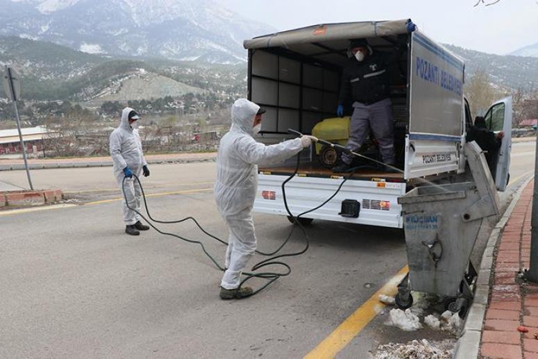 İlçede bulunan tüm çöp konteynerleri halk sağlığı açısından özel yaptırılmış dezenfekte ilaçlarla temizlendi. dezenfekte ve temizlik çalışmalarını sosyal medya hesabından paylaşan Belediye Başkanı Mustafa Çay, "Pozantı Belediye Başkanlığı olarak halkımızın sağlığı için üzerimize düşen tüm sorumlulukları ve riskleri gözden geçiriyor, yeni tedbirler alıyoruz. Bugün özel koruma elbiseli çalışan emekçi kardeşlerimiz ile ilçemizde bulunan çöp konteynerlerini özel dezenfekte malzemeleri ile temizleyerek virüs riski azaltmak için gayret ortaya koyuyoruz. Bizler için değerlisiniz." dedi.
