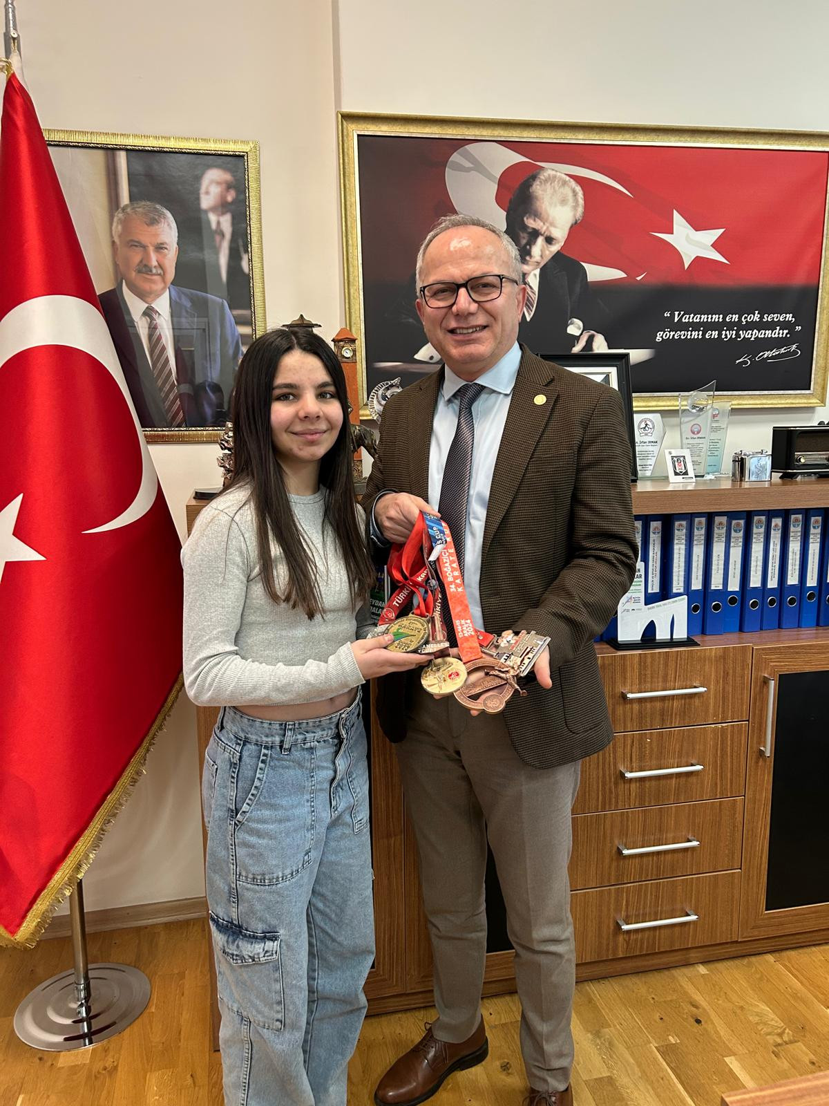 BAŞKAN ZEYDAN KARALAR ŞAMPİYON KARATECİ’NİN MADALYALARINI DİKKATLE İNCELEDİ.