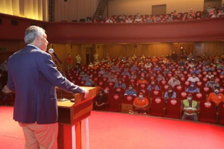 Adana Büyükşehir Belediyesi Tiyatro Salonu’nda sosyal mesafe kurallarına uyularak gerçekleştirilen, katılımın sınırlı sayıda tutulduğu personel bayramlaşmasında belediye çalışanlarına hitap eden Adana Büyükşehir Belediye Başkanı Başkan Zeydan Karalar, “Türkiye’de koronavirüsle mücadelede en başarılı üç ilin ismi sayılacaksa biri Adana’dır. Bu başarıda da Adana Büyükşehir Belediyesi’nin ve belediye çalışanlarının önemli rolü vardır. Kardeşlerimi fedakar çalışmalarından ötürü yürekten kutluyorum. Elbette Valimizin önderliğinde, başka kurum ve kuruluşlar da çalıştı ama Adana Büyükşehir Belediyesi çok iş yaptı. Engel tanımadan koronavirüsle mücadele etmeyi sürdürüyoruz. Gelirlerimiz büyük oranda düştü. Yoku, yokluğu paylaşıyoruz aslında. Koronavirüsün en fazla vurduğu, maddi açıdan çok zor durumda kalan kesimlere ayni ve nakdi destek verdik. 100 bine yakın koli dağıttık. Bayramdan sonra 100 bine tamamlayacağız. Dayanışma milletimizin en önemli ve bizi güçlü yapan özelliğidir.”