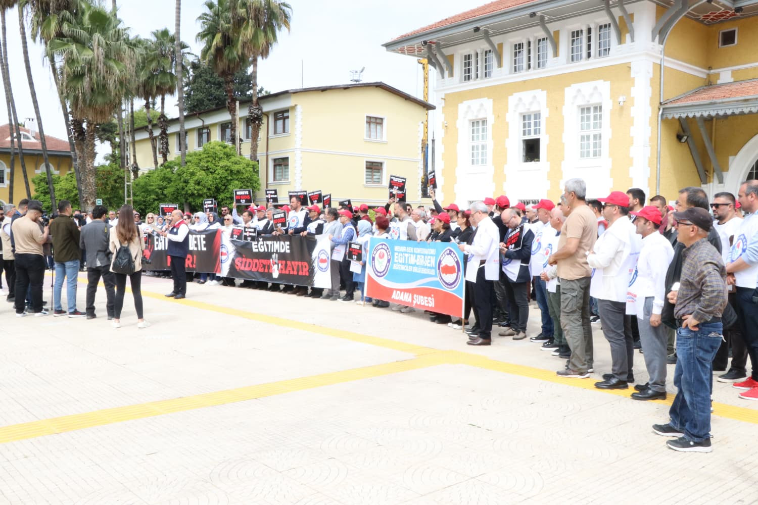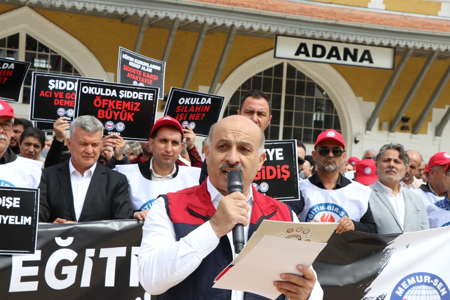 Siverek Ahmet Koyuncu Mesleki ve Teknik Anadolu Lisesi’nde okulun eski bir öğrencisi tarafından gerçekleştirilen saldırı, eğitim camiasını ayağa kaldırdı. Eğitim-Bir-Sen öncülüğünde Türkiye genelinde iş bırakma kararı alan eğitimciler, Adana İstasyon Meydanı’nda bir araya gelerek okullarda artan şiddet olaylarına tepki gösterdi.